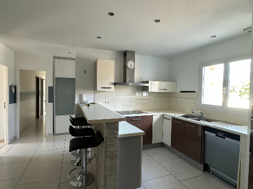 Le séjour de 41 m², prolongé par une terrasse couverte, invite à profiter de chaque saison. Elle est quipée d'un poêle à granulés et d'une pompe à chaleur qui assurent un confort agréable toute l’année. La cuisine ouverte crée une belle continuité, parfaite pour les moments partagés en famille ou entre amis.