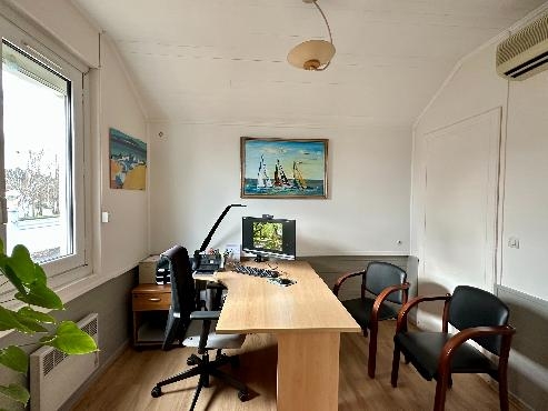 Le bien se compose d’une maison mitoyenne d’une superficie de 61 m², actuellement aménagée en partie à usage commercial avec un espace d’accueil, deux bureaux sur façade rue et à l’arrière, une cuisine, une pièce, salle d’eau et WC. Une dépendance indépendante de 41 m², à usage de garage et de réserves, complète l’ensemble.
